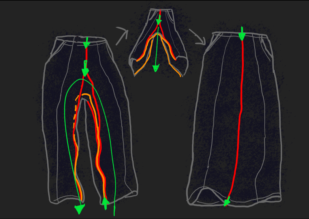 Functional zippers run along both the front and back, extending down the inner leg seams. A long separating zipper spans the entire inside leg. When unzipped and reconfigured, the pants transform into a full-length skirt, offering multiple styling options depending on how the zippers are used.
